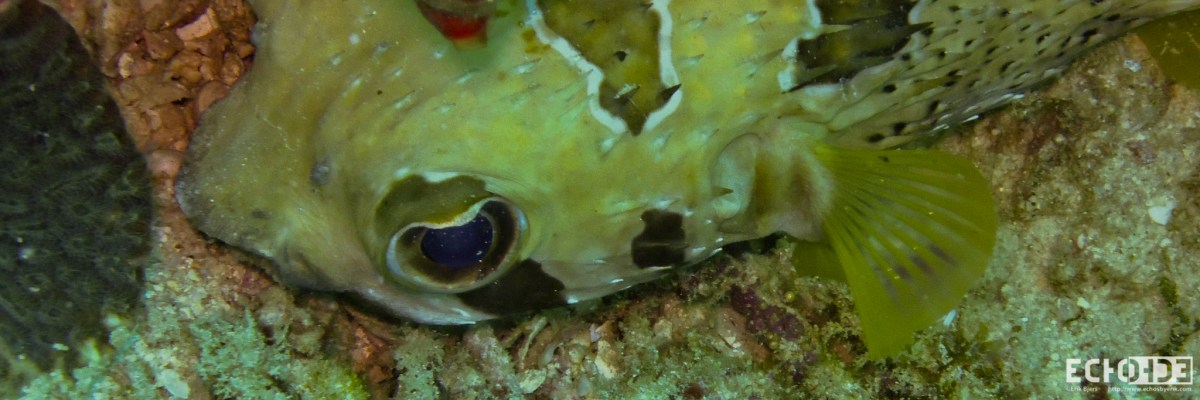 Boxfish Published April 1, 2013 at 2048 × 683 in Thailand ← Previous Next → A boxfish (Ostracion cubicus I think) hidding under a piece of coral.