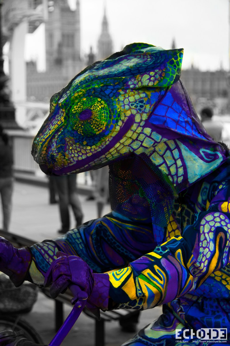 Lizard Man Published April 6, 2013 at 1360 × 2048 in London ← Previous A street performer dressed like a lizard riding a stationary bike along the banks of the Thames in London.