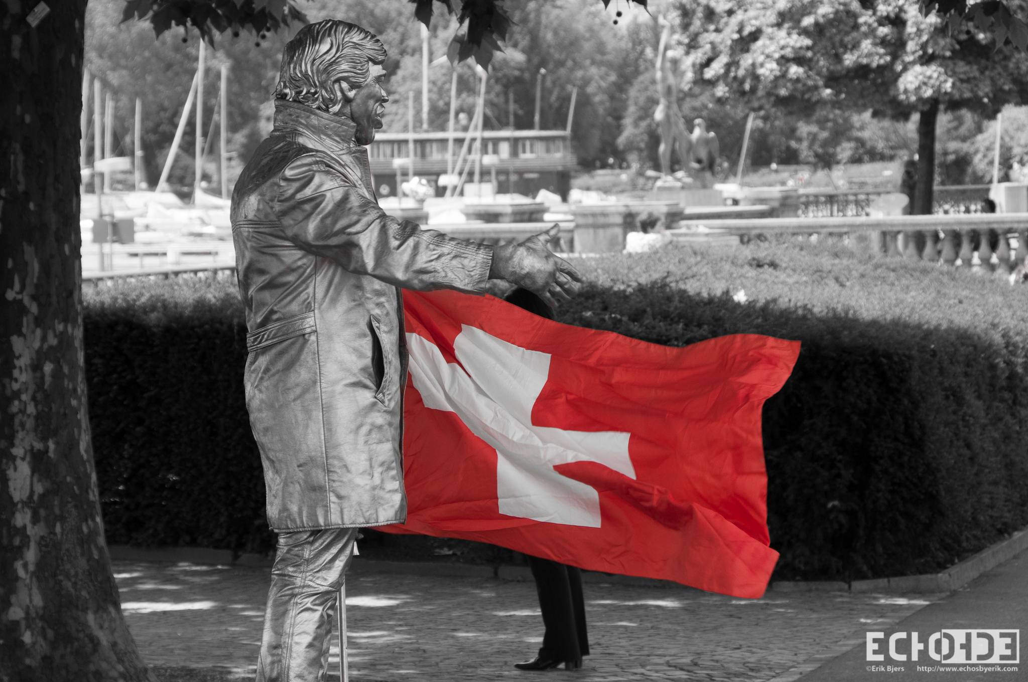 Fly the Flag Published April 10, 2013 at 2048 × 1360 in Paris and Zurich ← Previous Next → A street performer dressed as a statue holds the Swiss flag.