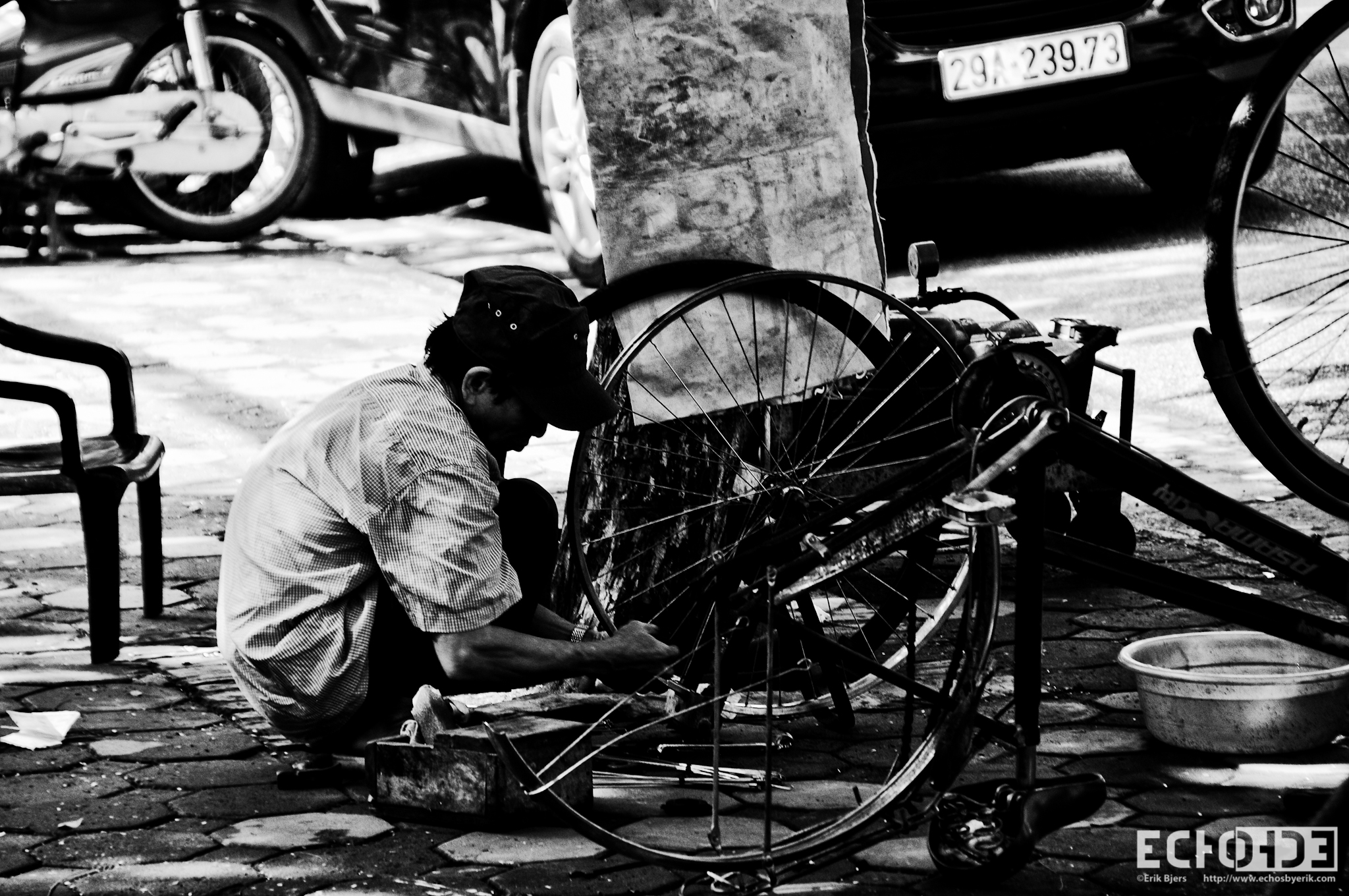 Bicycle Shop Published April 1, 2013 at 2048 × 1360 in Vietnam ← Previous Next → A man repairs a bicycle on the streets of Hanoi.